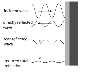 This reflection has been a problem ever since people started studying optics. For telescopes, light reflection from a lens reduces the efficiency of the system and the reflected light can add to the system noise. For eyeglasses, light reflection hides the eyes of the wearer (a cosmetic problem) and can also increase eyestrain. To circumvent these difficulties, scientists have used antireflection coatings for quite some time. The principle is based on interference, illustrated roughly below: a plane wave normally incident upon a thin transparent layer of material will reflect partially off the front and rear boundaries of the layer. If the layer is chosen to have an optical thickness of a quarter wavelength, and a refractive index less than the medium it is deposited on, the wave reflecting from the rear layer will be a half-wavelength out of phase with the front reflected wave and there will be destructive interference between them!