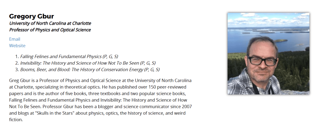 The Distinguished Lecturer Program selects a number of lecturers every year who can be invited to speak at Sigma Xi Chapters, and I offered to talk about two of my classic broad appeal topics — falling cats and invisibility — as well as one I’ve been working on for a while: the history of conservation of energy in physics.
