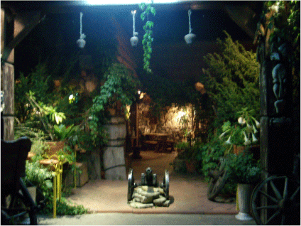 We only stopped three times on the drive, once to relieve ourselves by the side of the road, once for fuel, and once, sometime after midnight, at a themed cafe with lush green tropical foliage: