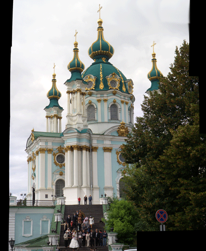 This is the magnificent St. Michael’s Monastery and Cathedral. It is actually a 1999 reconstruction of the original ancient edifice, which was pulled down by the Soviets in the 1930s. On the left side of the picture, to the left of the wedding party, is a squat, round ‘tortilla warmer’ building which holds some of the original foundations. The monastery is actually in use, and dark robed monks are constantly darting around the grounds.