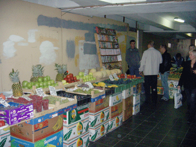 These underpasses have been transformed into large underground shopping centers, where pretty much anything from electronics to produce can be purchased. The photograph here shows a very short section of a subterranean produce market.