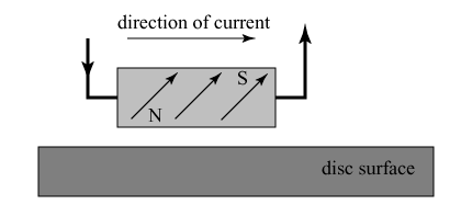 Some fields from the write-head ‘leak’ into the data layer, forcing the bar magnet in that layer to realign itself.