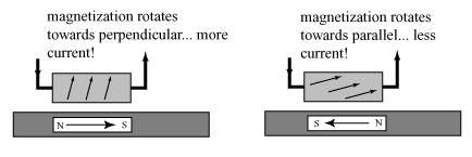 Descriptions of how an AMR read-head works are rather hard to find, unless one is skilled in reading patent jargon. From what I can figure, they typically work as follows: A strip of magnetic material to be used as a read-head is pre-magnetized along a direction diagonal from the direction the current will flow, as roughly illustrated below: