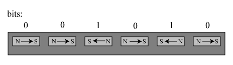 A computer hard drive essentially consists of a disc of magnetic material, and data is stored on that disc by modifying the magnetic properties to create ‘0’ and ‘1’ bits. It is perhaps most helpful to imagine the disc as a large collection of microscopic bar magnets, with north and south poles. If we define a ‘0’ as the north pole pointing to the left, and a ‘1’ as the north pole pointing to the right, we have a technique for encoding data, as illustrated below:
