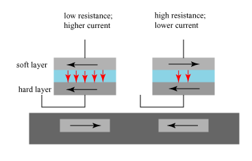 How does one use this in a read-head? Let us assume we have only two oppositely magnetized layers, but one of them is ‘hard’ (doesn’t change magnetization easily) while the other is ‘soft’ (changes magnetization readily when exposed to an external field). Our read-head will have the following two configurations: