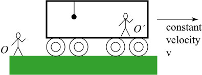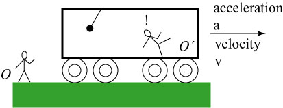 The best way to illustrate this is to look at a situation when observers disagree on the forces involved, because one of them is accelerating. Suppose we have a situation as illustrated below**. One observer is standing by the side of a set of railroad tracks, while another observer is sitting inside a closed railroad car. A pendulum is hanging from the ceiling of the railroad car.