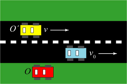 We have two observers in this picture: the ‘stationary’ observer O in the red car, and the moving observer O’ in the yellow car. The yellow car is moving at speed v = 55 mph and the blue car is moving at speed v_0=45 mph, according to the person at the side of the road. (These are, of course, the values the speedometers of the two cars will read.) How fast is the the blue car moving relative to the observer O’? Clearly, the velocity v'_0 of the blue car in the ‘primed’ reference frame is simply: