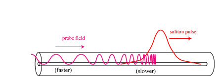 where c is the speed of light in vacuum. If an intense light pulse is sent through an optical fiber, and followed by a ‘probe’ light signal, the probe signal will experience a local slowdown when it reaches the vicinity of the intense pulse. This is exactly what is done in the experiment, as illustrated below: