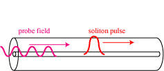 A Ti:sapphire laser is used to generate a 70 femtosecond soliton pulse. An infrared continuous wave probe field is sent after it. The system parameters are tailored so that the probe field has a slightly higher speed than the soliton, so that it can ‘catch up’. As it does, however, it encounters an increasing refractive index, which means that the probe field slows down. If the Kerr effect is strong enough, the probe field will be slowed down to a speed equal to the soliton pulse, and therefore cannot pass the soliton. The back end of the soliton pulse acts as a ‘white hole’ event horizon!