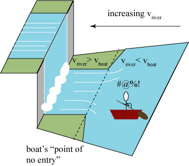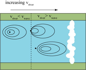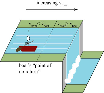 The ‘event horizon’ for the boat is not a physical limit as much as an engineering limit, as it depends on the maximum speed one can propel the boat. A more physical event horizon is formed by looking at the boundaries which waves cannot cross. Water waves have a fixed speed relative to a stationary medium, and event horizons can be formed with respect to these wave speeds. Waves generated beyond the ‘point of no return’ cannot travel upstream at all, and will inexorably slide over the falls: