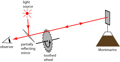 Light leaves a source, is reflected off of a partially reflecting mirror, and illuminates the spokes of a rapidly rotating toothed wheel. The teeth of the wheel break the light up into ‘pulses’, each of which travel to a distant mountaintop and are reflected by a mirror there. If the pulse returns while a gap in the teeth is present, the pulse passes through and reaches the eye of the observer. Knowing the distance to the mountain, the number of teeth on the wheel and the frequency of rotation at which the returning pulse reaches the eye, one can accurately measure the speed of light.