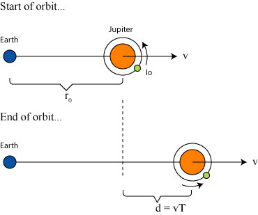 Suppose Jupiter starts out a distance r_0 from Earth at the beginning of one of Io’s eclipses (eclipse 1), that Io makes a full revolution of Jupiter in time T, and that Jupiter is moving away from Earth at velocity v. By the time the next eclipse begins (eclipse 2), Jupiter is now a distance d = vT further away from Earth than it was during eclipse 1. The light from eclipse 2 must travel a distance d = vT further than the light from eclipse 1 needed to travel, and will therefore arrive ‘late’ by a time