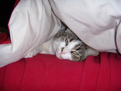 The next morning, I went in to find her, and called out her name. Usually she comes right away, but this time I heard a muffled ‘meow’, but no cat! I peeked under the bed several times, but couldn’t spot her amongst the clutter. I circled the bed several times, scratching my head, until I noticed the bulge underneath the comforter. I lifted up the end carefully, and found…