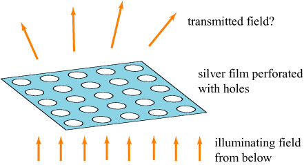 In 1998, however, a group of researchers led by Thomas Ebbesen investigated the amount of light transmitted by an array of holes, as illustrated below: