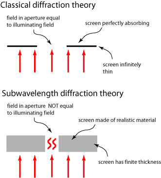 If this explanation seems a little vague to you, you’re not alone. In fact, two of the original authors of the plasmon paper later refuted their own work, insisting that the enhanced transmission can be explained using classical diffraction theory alone! The truth of the matter is that sometimes plasmons play the dominant role, sometimes diffraction theory does, but how can one distinguish the two cases? One of the major difficulties of nano-optical research, and one of the reasons it is a field of interest, is that simple models of light interacting with subwavelength structures are not readily available. To understand this better, consider the classical optics problem of the diffraction of light by a hole in a screen, and its subwavelength counterpart, illustrated below: