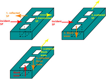 The six pieces represented are: 1. SP reflected by a hole chain, 2. SP transmitted by a hole chain, 3. SP converted to a Bloch wave (a wave based on the periodicity of the hole chain), and vice versa, 4. SP converted to a plane wave, 5. Bloch mode converted to a plane wave, and 6. reflection of the Bloch mode.