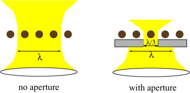 Light is focused by a lens from below onto a collection of brown particles. With the lens alone, one cannot shine light on individual particles: at best, one will always illuminate three of them. If an aperture of width 1/3 of the wavelength is used to block the light, we can illuminate a single particle at a time. However, those particles must be close to the aperture, because the light field spreads rapidly upon exiting it.