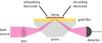A rat sciatic nerve is adhered to a 50 nm thick gold film. Electrodes are attached at the ends of the nerve for stimulus and conventional pMEA measurement. A laser diode of wavelength 635 nm and 5 mW output power is used as illumination. After beam expansion, the field is focused into a glass prism and is refracted into the gold film, at which surface plasmons are excited, using what is known as the Kretschmann configuration. Surface plasmons have a different wavelength than light of the same frequency, which means that the momentum of an excited plasmon is higher than that of a comparable photon. The Kretschmann configuration uses the phenomenon of total internal reflection to provide the missing momentum: light is passed into a prism at an angle at which it would be in principle completely reflected. In fact, an ‘evanescent wave’ is produced in the space past the prism, and this evanescent wave has a higher momentum than a freely traveling photon. The evanescent wave can couple into a surface plasmon, and vice versa.