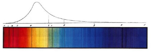 The upper part of the figure indicates the relative brightness of each color of the spectrum. The lower part of the figure shows the appearance of each color in the spectrum. There are numerous isolated frequencies (colors) which have no brightness at all. It was later determined that these missing colors were due to absorption of the Sun’s light by atoms.