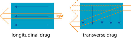 Fizeau’s experiment involved what we might call longitudinal drag: the light and the material are both moving in the same direction. One can also consider the complimentary case of transverse drag, in which the material is moving perpendicularly to the light. The two cases are illustrated below: