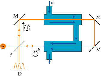 Collimated light from a source (S) is split into two beams at a beamsplitter (P). Part of the light follows path 1 around the interferometer and part of the light follows path 2. The light passes through two tubes of flowing water: light on path 1 is ‘dragged’ forward and arrives at the detector plane (D) faster than light on path 2, which is ‘dragged’ backward by the water. The light beams from path 1 and path 2 interfere on the detector plane and produce interference fringes. If the flow of water is now reversed, the light on path 1 is now the ‘backward dragged’ light and the light on path 2 is now the ‘forward dragged’ light. The interference fringes at D will shift, and from this shift one can deduce the size of the drag coefficient. Fizeau in fact measured results in agreement with Fresnel’s formula.
