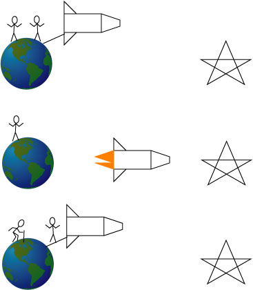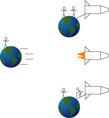 But, one might argue, since all motion is relative, can’t we just as well look at the scenario from the point of view of the traveling brother? From his point of view, it appears that the Earth rockets off at very nearly the speed of light, and comes back. Using this argument, one would say that the traveling brother would find that his Earthbound counterpart is younger: