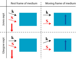 The differences between the Jones experiment and the Glasgow experiment are schematically illustrated below, both in the lab frame and the medium reference frame (adapted from the paper):