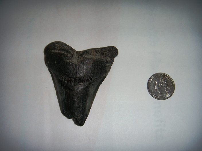 The megalodon was a giant prehistoric shark that roamed the seas between 18 million and 1.5 million years ago.  Like all sharks, its skeleton was made of cartilage, not bone, and so the only fossilized pieces of the sharks which have survived are their tremendous teeth.  The teeth are quite common, and can even be found near where I live.  This one I picked up at a Renaissance fair last year.