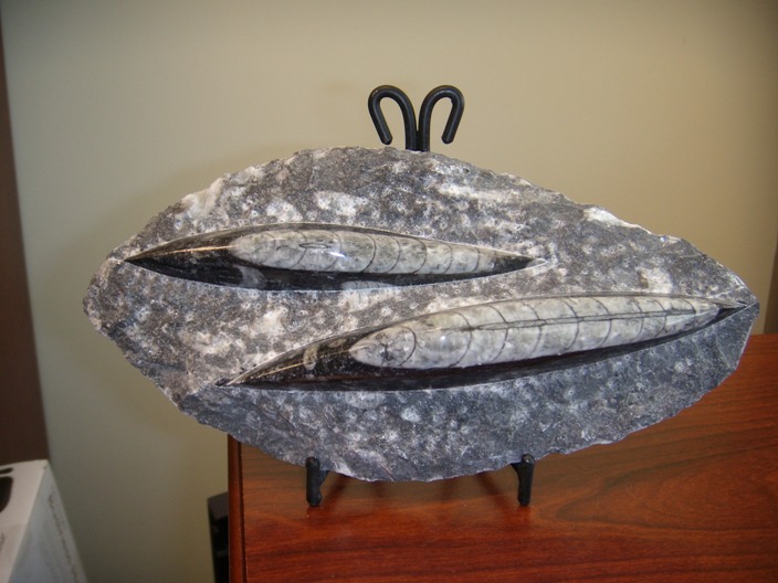 I picked up this fossil on a trip to Charleston.  It is identified as a cephalopod called ‘orthoceras’, some 400 million years old, and excavated in Morocco.  It sits next to my computer on my desk.