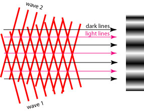 The interference of the two plane waves produces a light field which contains a collection of parallel light and dark lines. The image on the right is an illustration of what this pattern would look like when projected on a flat surface.