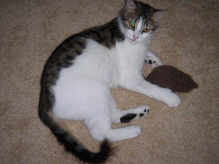 Well, I think I’m pretty up to date with cat pics. My apologies for the kinda crappy quality; I have a really bad camera with low light sensitivity, which makes even brightly lit indoor pics a hassle. Thanks again to Janet for the rat!
