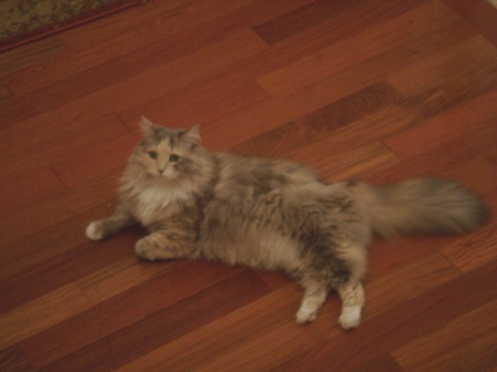 Our prettiest cat is, without dispute, Sasha. I snapped a picture of her on the hardwood floors, which made a nice contrast: