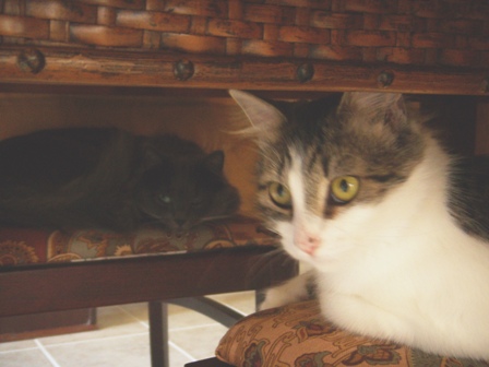Sabrina and Zoe are friends, to some extent, though Zoe gets crabby and doesn’t like to be bothered at times. Here’s a picture of Sabrina following Zoe’s lead and taking a seat under the kitchen table: