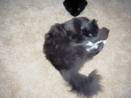 I haven’t done any catblogging for a while, which is a shame ’cause I’ve got lots of cute cat photos. Moving into a new house provides lots of opportunities for unexpected cat cuteness. Also, we received a very nice gift in the mail yesterday from my fiancée’s sister Janet, who is an extremely talented knitware designer and author and blogs about it here. Janet has knitted little catnip-filled mice for our kitties before, but the fiancée requested something a little larger that the cats can really wrestle with when the mood strikes them. The result? A catnip rat! It was an immediate hit with the kitties, who each took turns wrestling with it. Zoe’s turn is pictured below: