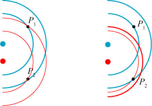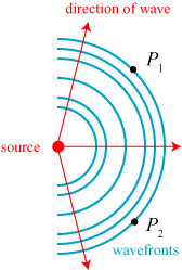 The wavefronts (the peaks of the wave, illustrated in blue) are not equally spaced for a non-monochromatic wave.  However, at points P1 and P2 which are equally distant from the source, the fields are identical.  If the wavefields have a definite relationship to each other — in other words, they are correlated — at those two points in space for all time, they can interfere with one another; this is illustrated schematically below:
