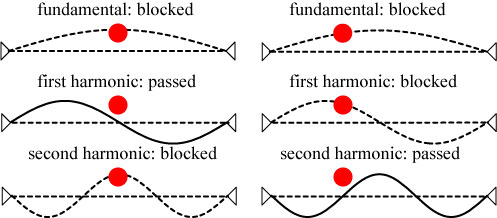 Part of the distinctive sound of any stringed instrument is the relative weights of the fundamental mode and the higher harmonics.  For an ordinary pluck of a guitar string, the fundamental mode will dominate.  The next couple of modes have some appreciable amplitude, but beyond the third mode the amplitude is negligible.  How do we isolate one of the higher harmonics and suppress the fundamental mode?  We’ve already described how guitarists do it: by lightly blocking the string with a finger at a location which doesn’t obstruct a harmonic.