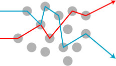 There are two important lessons to be learned from this picture: 1.  Because of the multiple ‘bounces’ of light, is it impossible to predict the output path of incident light (just like a pachinko machine), and 2.  Light entering the medium at different locations can come out at very different locations and directions.  Light may not even make it all the way through the medium; it may get sent back out the way it came (effectively reflected) or bounce around long enough that it eventually gets absorbed.