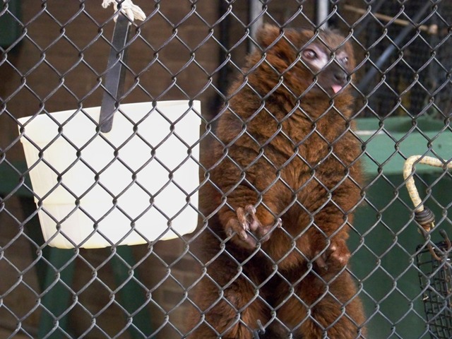Another favorite, which I was very familiar with, are the red ruffed lemurs. This one demonstrated that they can get their food just as easily while inverted:
