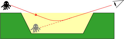 In my figure, the light ray reflected off of Khalk’ru on the other side of the valley is bent in such a way that makes it appear that a Khalk’ru is in the valley itself, as well as being on the other side! In the case of Jim and Leif, they apparently see images of the distant mountains and sky in place of the actual contents of the valley.