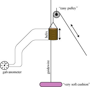 For the first experiment, Faraday twisted 350 feet of copper wire into a hollow cylindrical helix 4 inches long, with an internal diameter of 1 inch and an external diameter of 2 inches. This helix was attached to a line running along a pulley, allowing it to be raised 36 feet and dropped onto a “very soft cushion”. Long wires connected the ends of the helix to a sensitive galvanometer, placed 50 feet away and level midway with the path of the helix. This is illustrated below: