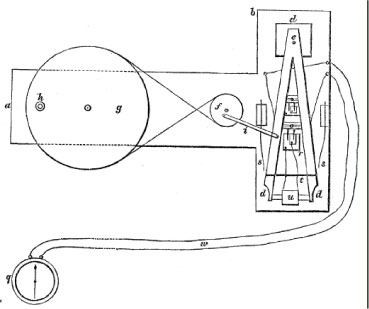 A short description of this device is as follows. A wheel g is turned via handle h, which rocks the wooden lever d,d,d in oscillatory motion constrained by springs s. This motion moves a metal cylinder through the fixed helix u, and any current produced is converted to a single-direction current by the commutator r. Finally, the current is registered at galvanometer q. In this system, currents could be produced by induction by the earth’s magnetic field; Faraday canceled this effect by using magnets to negate the earth’s field. In this configuration,
