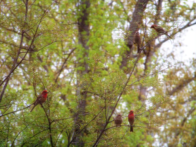 Today, we heard a very raucous peeping coming from the nest, along with some rustling.  Suddenly, a flock of birds appeared on the tree in front of our house: