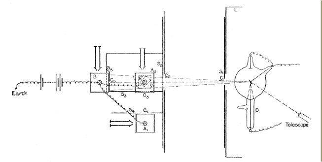 The X-ray bulb, D, emanates rays in all directions.  Those which are horizontal and, by hypothesis, horizontally polarized, pass through a pair of apertures in screens S_1 and S_2.  After the apertures, most of the primary beam passes to electroscope B; however, secondary radiation is created by scattering from air.  Radiation which passes horizontally (downward in the figure) is collimated by another pair of apertures and can be detected by electroscope A_1.  Radiation which passes vertically (into the figure) is collimated by other apertures and can be detected by electroscope A_2.