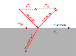 A light ray illuminating an appropriately-chosen plasmonic surface will be projected into three components: a reflected ray, a transmitted ray, and a surface plasmon, as pictured below: