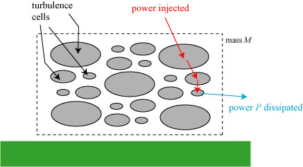 A mass M of air, confined to a box, is illuminated by the sun, which adds a certain amount of energy/second to the system. This energy creates ‘turbulence cells’, regions of more or less uniform atmospheric properties. As time evolves, these cells break down due to viscous forces into smaller and smaller cells, until they reach a size at which they break up completely and their energy is dissipated; the rate of energy dissipation (energy/second lost) is called P.