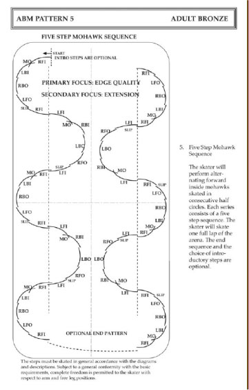 “Moves in the field” refers to skating elements such as various turns and edge transfers, basically all those techniques that can be used to get from point A to point B. To give you an idea of what is involved, here is the official test book figure of the “5-step mohawk” pattern I had to perform: