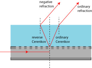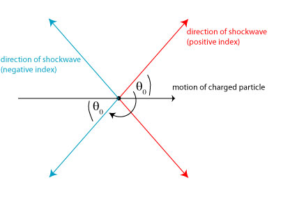 Čerenkov radiation (I prefer this spelling) is an effect analogous to the sonic boom created by projectiles moving faster than the speed of sound.  Čerenkov radiation is emitted by ultra-high speed charged particles moving in matter.  In ordinary matter, this radiation travels along the direction of motion of the particle; in a negative refractive index material, Vesalago predicted that Čerenkov radiation will travel in a direction opposite of the direction of the particle. Now, we have some preliminary experimental evidence supporting this prediction.
