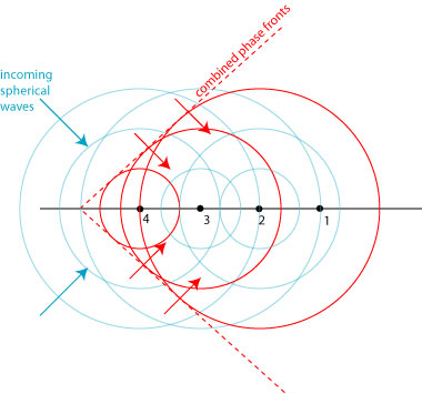 Point source 4 is still “ahead” of the others, but because the spherical waves are converging, this means that its wave has become smaller than the corresponding ones from the other points.