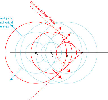 Any light wave may be mathematically expressed as a superposition of monochromatic waves (in what is known as Fourier analysis), and so we may gain insight into our Čerenkov problem by considering radiation from a collection of monochromatic sources.  Let us suppose that we have a collection of monochromatic point sources equally spaced on a line, and sources to the right are phase delayed relative to the sources on the left (the sources on the left radiate “sooner”).  The picture of the waves looks very similar to the first picture we drew for Čerenkov radiation:
