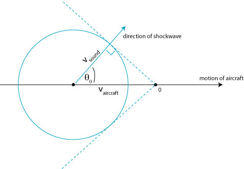 With this picture, we see that the shockwave travels at an angle\theta_0 to the direction of motion of the aircraft satisfying: